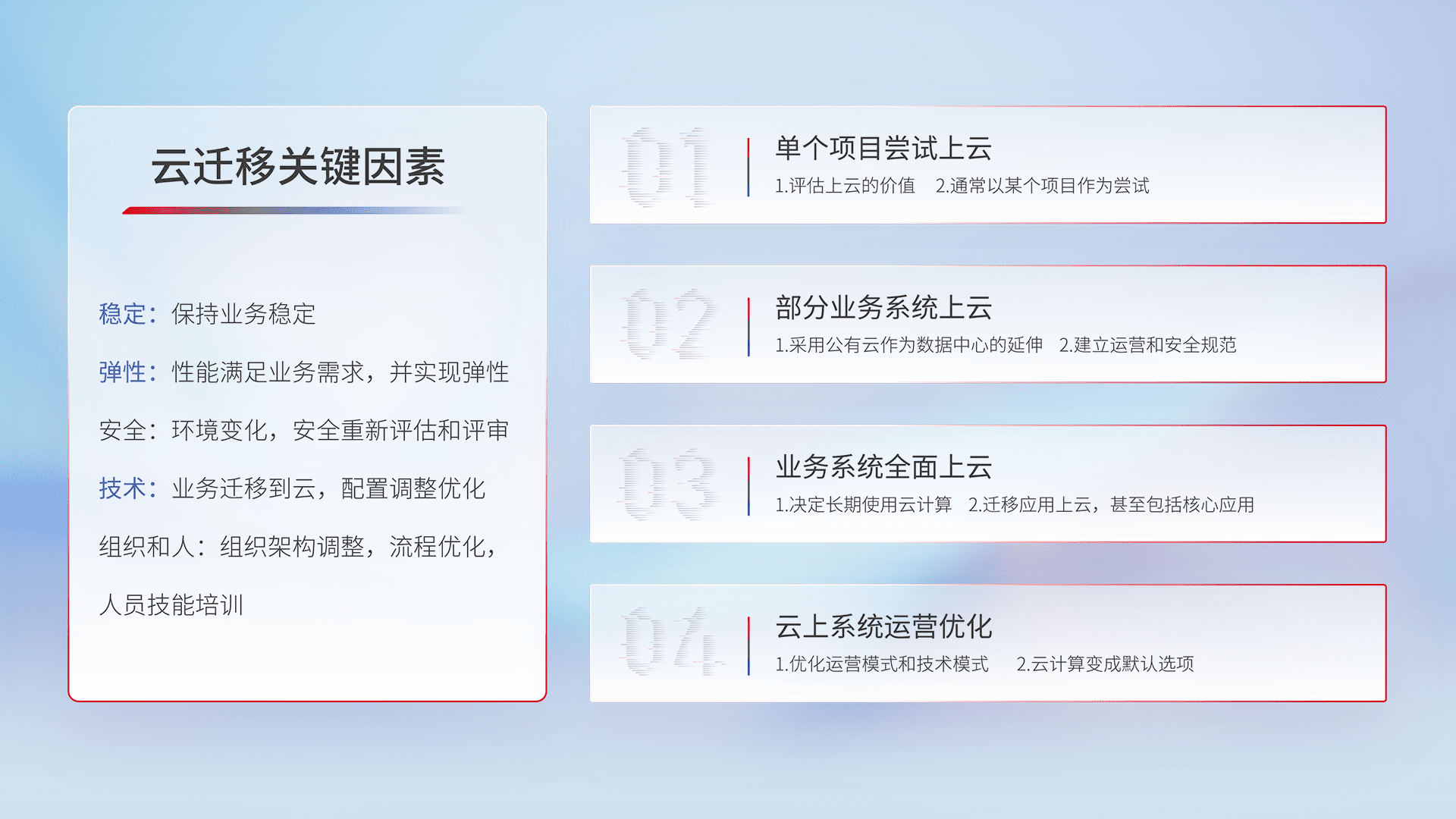 结合实际业务,,,,从规划设计、、、云平台选型、、云原生改造、、数据迁移、、、、集成交付,,迁移全过程为客户识别最佳上云路径,,,,做好风险识别管理,,,设计网络架构、、、身份权限、、安全审计合规、、操作审计、、日志审计、、、监控告警策略、、多站点容灾设计等,,对云上基础设施进行整体规划,,,提升IT治理水平,,,以满足弹性、、高可用、、、高性能的需求。。。